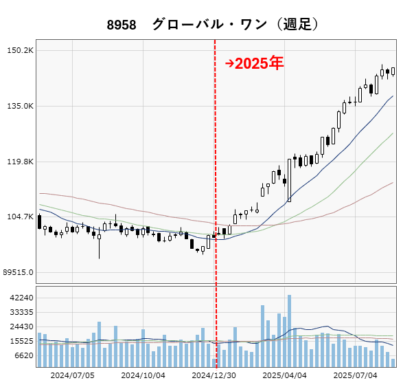 中でも動きが良いのがグローバル・ワン不動産投資法人(8958)で、同じ期間で47.5%上昇(分配金の影響は除く、これ以降の銘柄も同様)しています。チャートを見ると、今年に入って動きがガラッと変わったことが見て取れます。