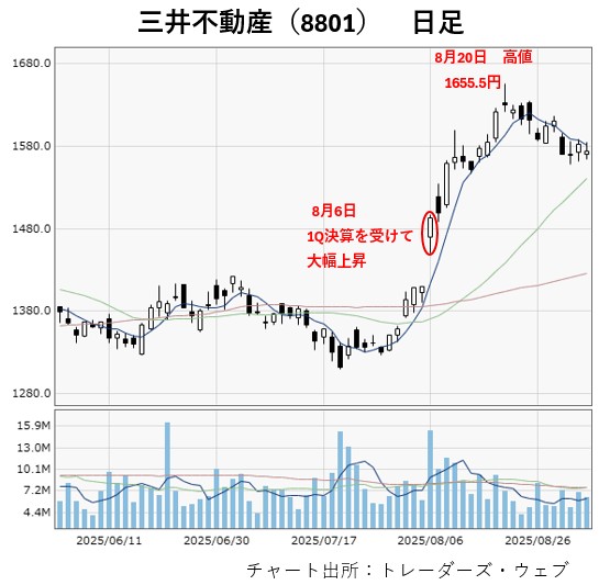 株価は1Q決算が好感されて8月6日に大きく水準を切り上げており、その後も買いが続きました。8月20日には1655.5円まで上昇しており、この時点での年初来高値を更新しています。