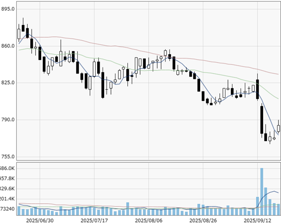 このようにすべてのセグメントが減益となっています。なお、決算発表を受けた翌営業日の株価は下落となり、一時773円まで下げ幅を広げました。