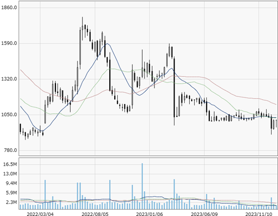 同社は2022年6月に23.4期通期の連結営業利益予想を100.0億円(前期比45.3%増)と発表し、その後の株価は1792円まで上昇しました。