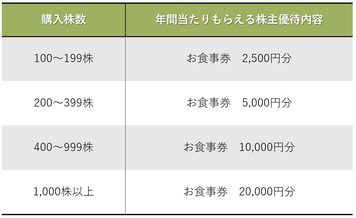 お食事券は7月頃に発送され、有効期限は翌年6月末までの約1年間です。株式の保有数に応じて贈呈される株主優待の内容は、下記の一覧表をご確認ください。