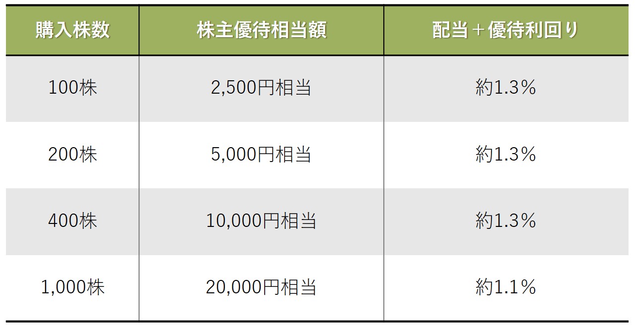 1株3500円で100株購入した場合、投資金額は35万円です。配当金は2000円のため、配当利回りは約0.6%になります。また、株主優待として年間で2500円相当のお食事券が贈呈されるため、配当と優待を合わせた利回りは約1.3%です。