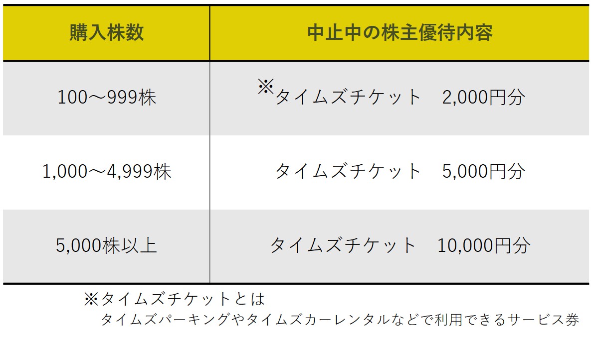 パーク24の株主優待は、2023年10月末贈呈分から中止されています。新型コロナウイルスの影響による業績悪化に伴い中止となり、今年で3年目です。業績が回復すれば再開を予定しているとのことですが、業績が回復しなければ、このまま廃止になる可能性もあります。