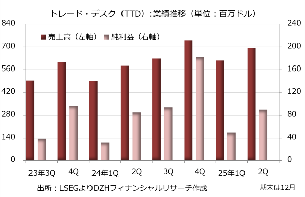トレード・デスクはデジタル広告の費用対効果を高めるデマンド・サイド・プラットフォーム(DSP)を運営しています。広告代理店や広告主など広告を出稿する側にクラウドベースの総合的なプラットフォームを提供し、利用額に応じて手数料を受け取るというビジネスモデルです。