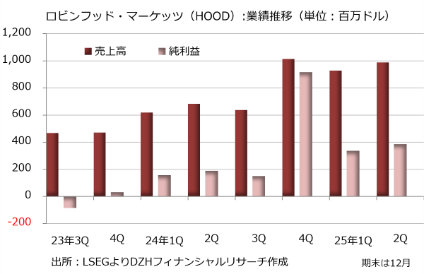 ミーム株ブームの折にはコンプライス面で問題視されるケースもありましたが、現在では利便性の高いプラットフォームとしての評価が高く、晴れてS&P500銘柄の仲間入りを果たしています。業績も2021-23年は通期で赤字を計上しており、2024年12月期に初めて本格的な黒字に転換しています。