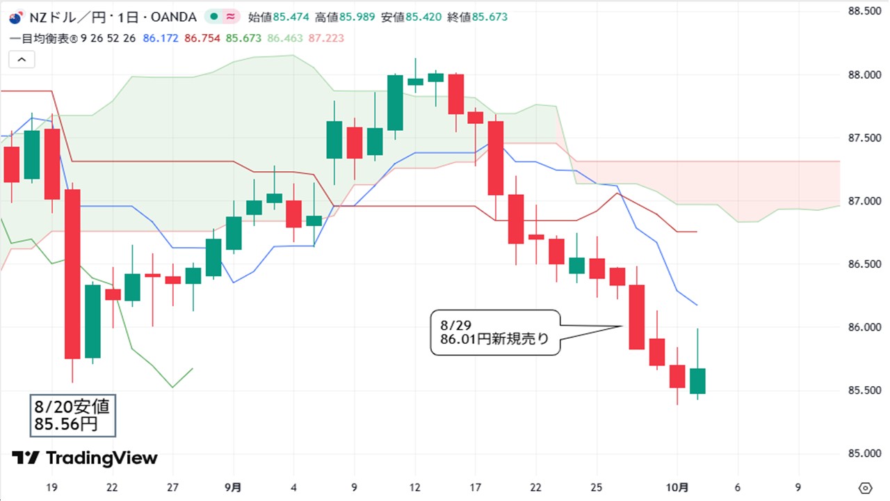 NZドル円86.01円売りポジ、損切りは転換線86.17円に微調整。昨日から本日にかけて85.30円台で底堅さを見せているのは気がかり。場合によっては目標値にこだわらず部分利確も視野に入れたい。