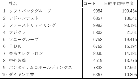 これらの銘柄のうち6月から9月にかけて株価が右肩上がりとなっているのは、ソフトバンクグループ、アドバンテスト、フジクラの3社。5月終値と9月終値を比較してみると、ソフトバンクグループの株価は2.5倍、アドバンテストの株価は2.0倍、フジクラの株価は2.2倍となっています。日経平均株価の上昇への寄与ということであれば、この3社が影響が大きかったと考えられます。