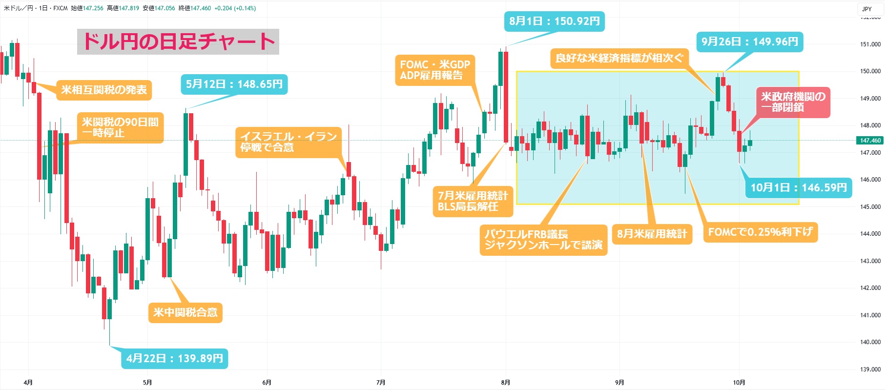 そして、10月1日には米政府機関の一部が閉鎖に。「米経済を下押しする」との懸念から、リスク回避の円買い・ドル売りが優勢になると一時146.59円と9月17日以来の安値を付けています。9月ADP全米雇用報告で政府部門を除く非農業部門雇用者数が3.2万人減と予想の5.0万人増に反して減少したこともドル売りを促しました。
