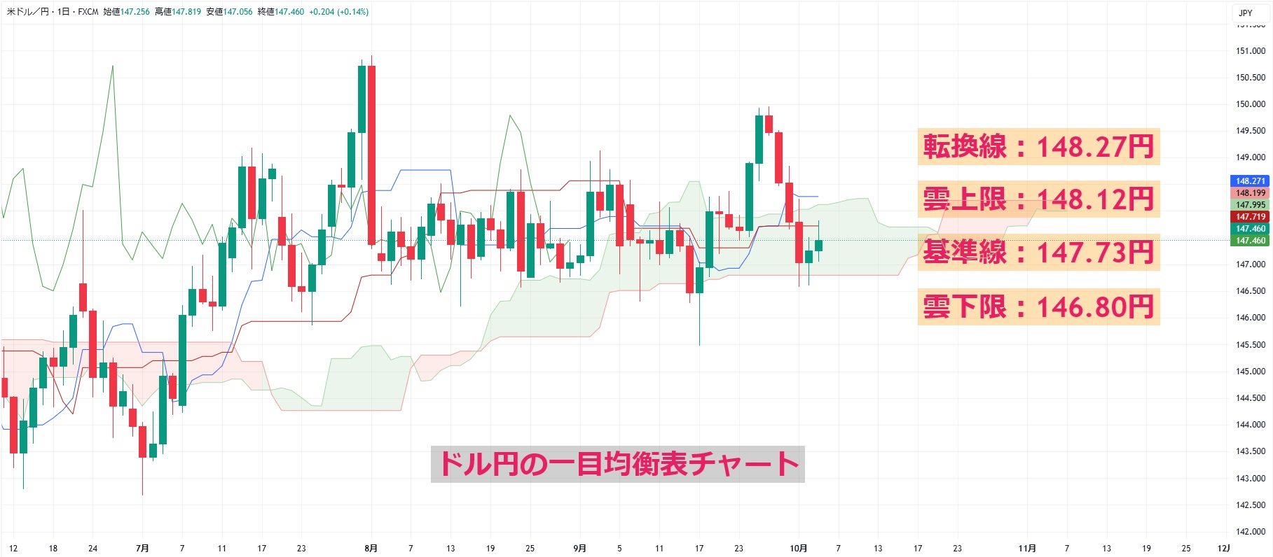 ドル円の一目均衡表チャートを見ると、週末の終値(147.47円)で転換線(148.27円)や雲の上限(148.12円)、基準線(147.73円)を下回った一方、雲の下限(146.80円)は上回っています。今回こそは8月1日の7月米雇用統計ショック後のレンジをブレイクし、節目の150円や8月1日の東京時間に付けた高値150.92円の突破を期待していましたが、残念な結果に。