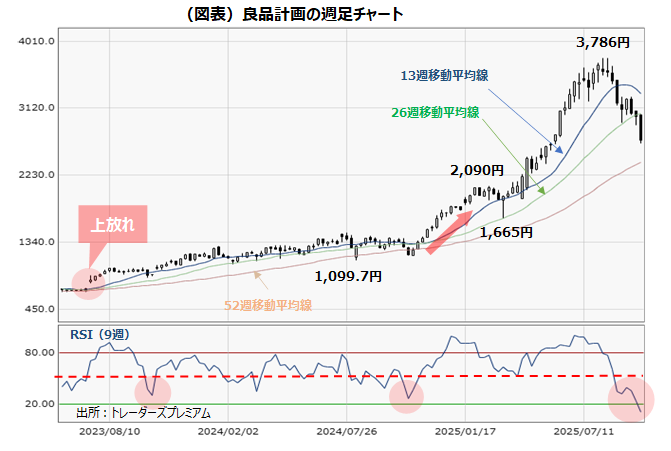 図表は、良品計画(7453)の2023年6月頃からの週足のローソク足に加え、13週・26週・52週移動平均線です。下位は、売られ過ぎや買われ過ぎ、勢いなどをみるオシレータ系指標で代表的な相対力指数のRSI(9週ベース)の推移です。
