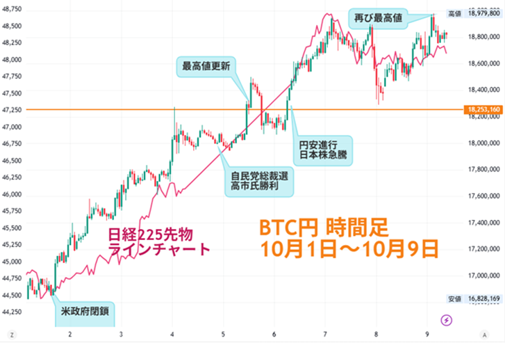 総裁選前から底堅かったBTC円は、結果が出た翌日曜日から買いの勢いが強まりました。8月に記録した1825万円を上抜けて史上最高値を更新し、7日未明(NY時間6日午後)には1895万円まで上げ幅を広げました。