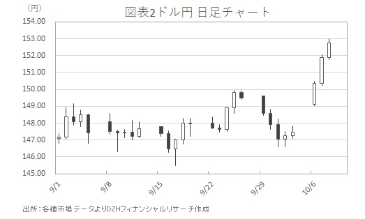 株高の勢いは円相場にも波及しました。ドル円は先週末の147円半ばから、週明けには149円台へ上昇、さらに150円半ば、7日には152円台、8日には153円台まで値を伸ばす局面も見られました(図表2)。「高市トレード」の下で、短期的な円売りが出やすくなっています。