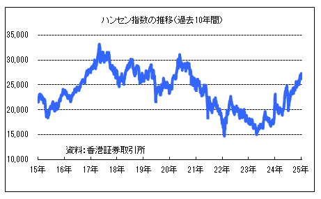 ハンセン指数が27000ポイントを突破するのは過去10年間で今回が4回目となります。ハンセン指数はこれまでに大きく分けて17年7月、19年1月、20年12月ごろから始まった上昇でいずれも27000ポイントを突破し、最終的には30000ポイントの大台も超えていることから、市場では今回も30000ポイント突破が視野に入ったとし、一段の上昇に期待が高まっています。