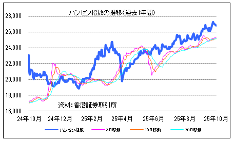 中国本土市場は国慶節・中秋節にあわせて10月1-8日が休場となりましたが、香港市場は1日(国慶節)と7日(中秋節の翌日)の2日間のみが休場で、そのほかは通常取引が行われていました。本土休場中も香港市場は好調で、2日は米連邦準備理事会(FRB)による利下げや中国当局による景気対策への期待などから買いが広がり、ハンセン指数は取引序盤に心理的節目の27000ポイントを突破すると、終値で2021年7月23日以来、約4年2カ月ぶり高値を更新しました。