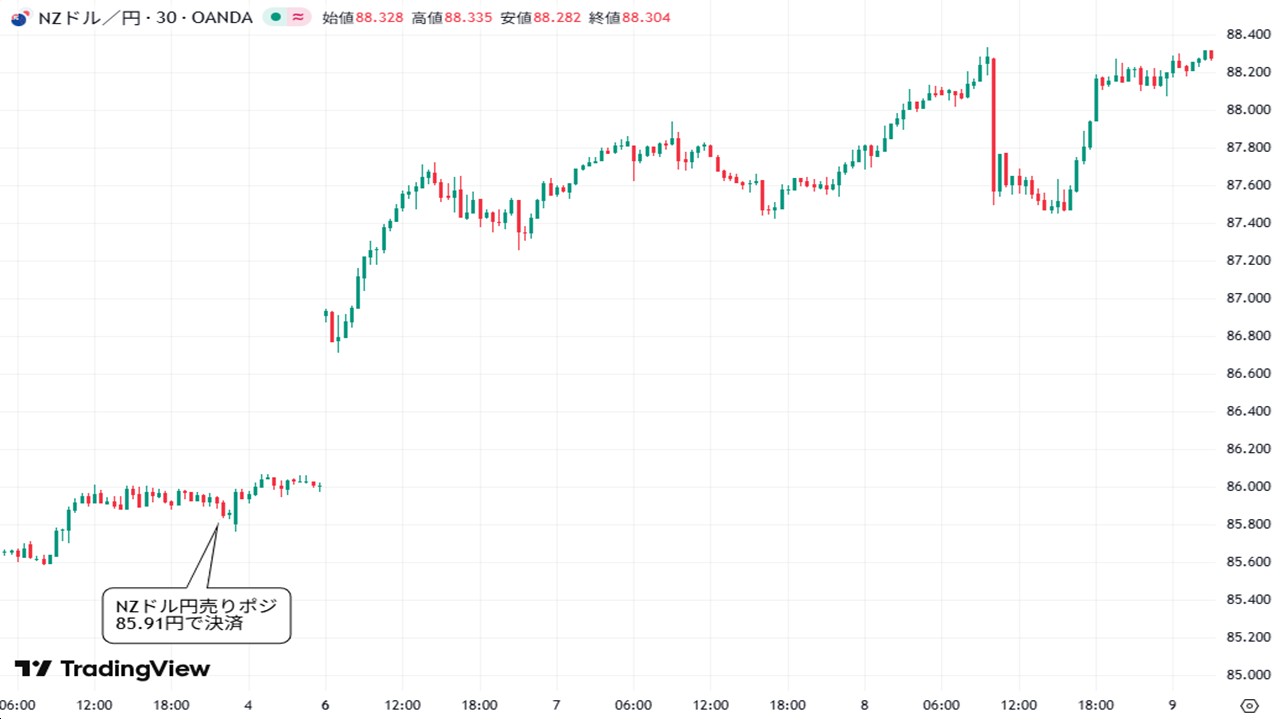 NZドル円86.01円売りポジは現在レート85.91円で決済。明日は自民党総裁選、何だかんだ言っても選挙は「やってみないとわからない」ものであったり。そんなリスクは背負えないのでノーポジにする。