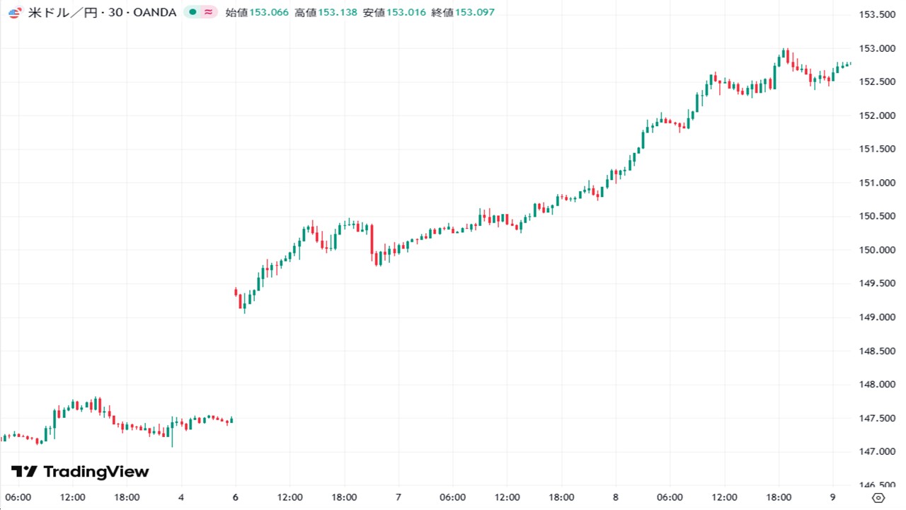 週明けはチャート上に窓を開けて始まると、その後は下押すも小幅にとどめて堅調に推移。8日に153円台に乗せています。