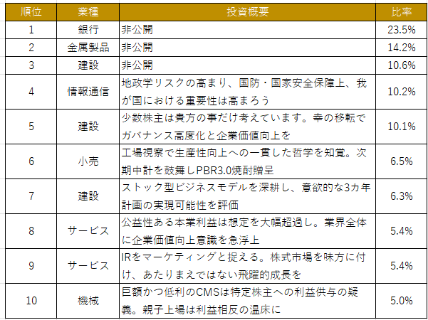 また、前回9位で組み入れ比率3.7%だったサービス業については組み入れ順は10位とダウンしましたが、組み入れ比率は3.7%から5.0%に上昇。市場で一部買い増しを行ったと思われます。