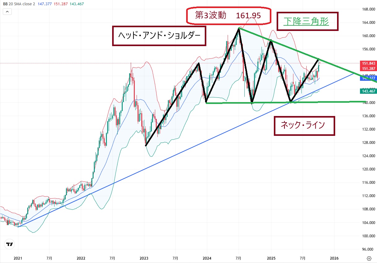 2025年の第2次トランプ米政権(2025年~2028年)でのドル円は、エリオット波動分析での「第4調整波動」による「三角保ち合い」を形成中であり、第4調整波動のX波動を形成中だと思われます。