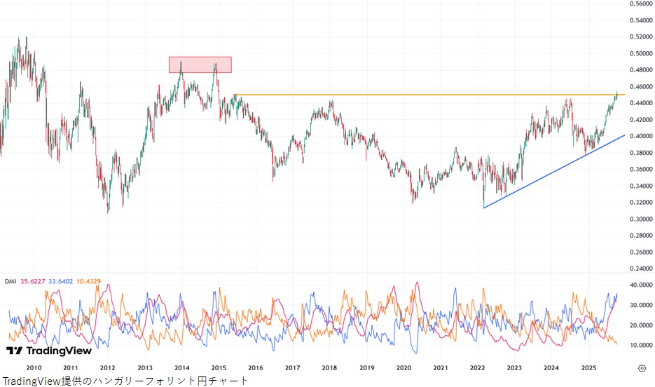 フォリント円は先月に入って昨年高値の0.44円台、節目の0.45円(チャート上の黄色実線)を上抜け。2015年から10年以上に渡って上値を抑制してきた水準を上抜けてきました。
