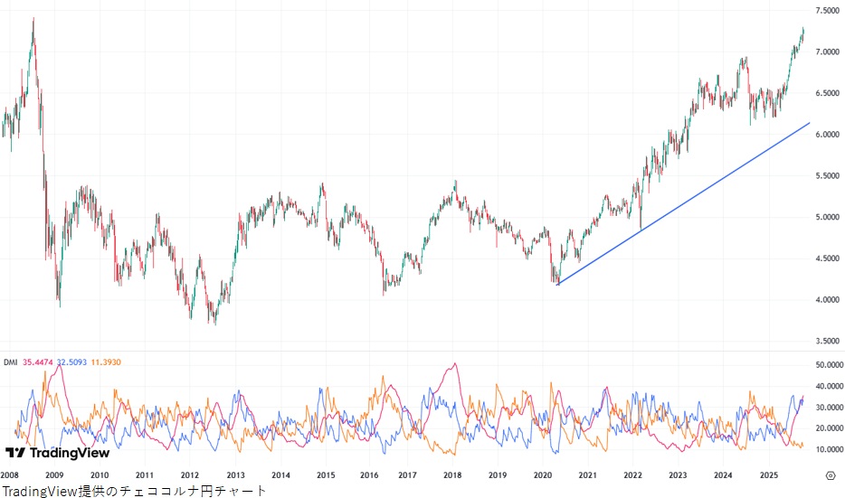 チェコ・コルナ円の週足チャート分析:史上最高値が目前に迫る、押し目買い方針は継続