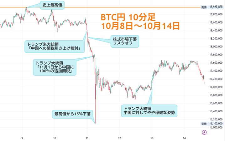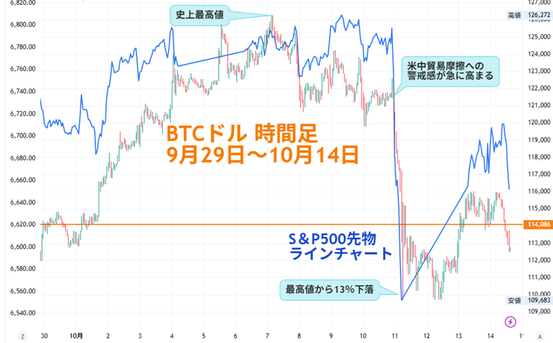 その後、NY市場の終盤(11日の日本時間未明)に、トランプ大統領は「米国は11月1日から中国に100%の追加関税を課す」と発表。週末の流動性の薄い時間帯にリスク資産への売り圧力が強まり、BTCドルはNY序盤の12万2000ドル前後から11万ドルを割り込む場面がありました。