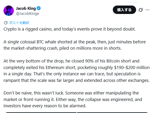投稿では「暗号資産市場は“仕組まれたカジノ」と言っています。