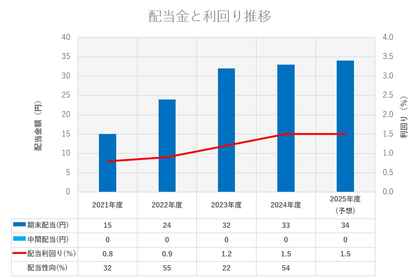 2025年度の配当金は、11月末の期末配当にて、年間1株当たり34円となる予想です。この金額は、2016年度の1円、2017年度の2円、2018年度の4円、2019年度の6円、2020年度の7円、2021年度の15円、2022年度の24円、2023年度の32円、2024年度の33円から、9期連続で増配しています。