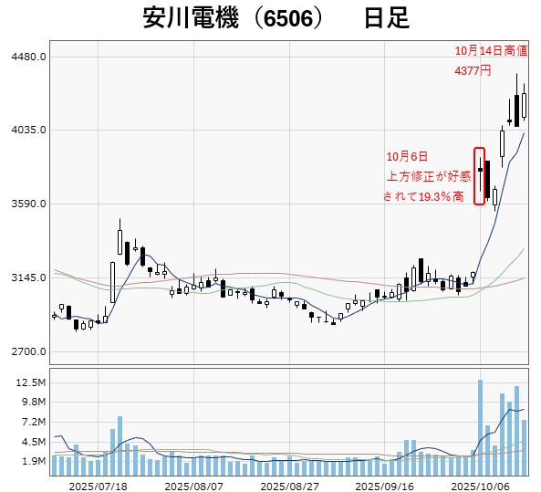 安川電機はサーボモータ、インバータ、産業用ロボットなどに強みを持っています。10月3日には上期の決算を発表しており、この時に通期の見通しを上方修正しています。