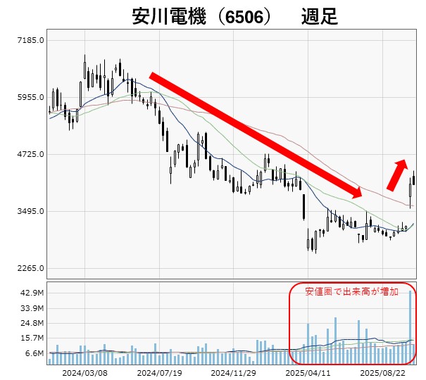 また、安値圏で出来高が増加しています。ダラダラと下げが続いているうちは買い妙味が乏しいため、商い自体が盛り上がりません。安値圏で出来高が増えているということは、その水準で買いたい投資家が以前よりも多くなっていると考えられます。