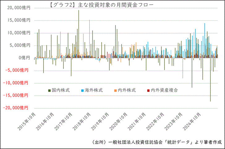 資金フローを投資対象別にみてみましょう。【グラフ2】は、国内籍公募株式投信における主な投資対象別の資金動向です。