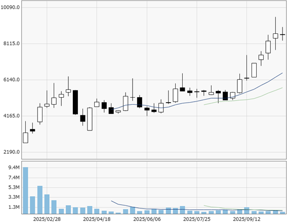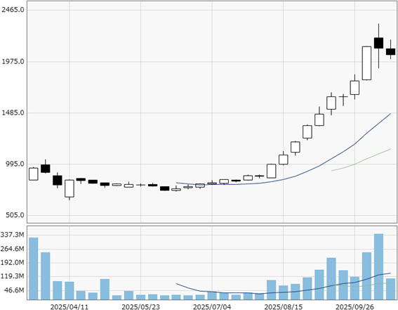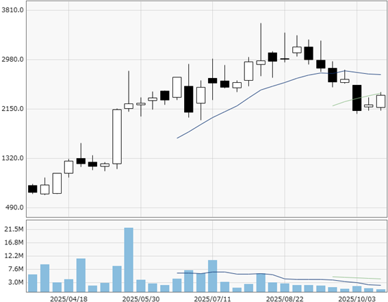 この発表後から、同社のAI向け製品への期待が高まり、株価は上昇トレンドに転換。2025年8月から2025年10月まで株価は上昇が続き、2025年10月7日には2339円まで上値を伸ばしました。