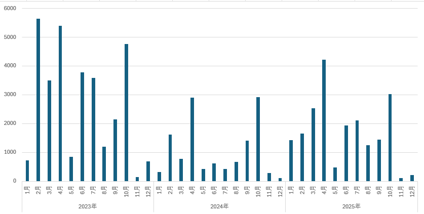 2025年通年での値上げ品目数(12月までの公表分含む)を見ると、累計で2万0381品目となりました。2024年の実績(1万2520品目)を62.8%上回りました。11月までの公表分時点で2万品目は超えていましたが、そこからさらに300品目強増加したことになります。