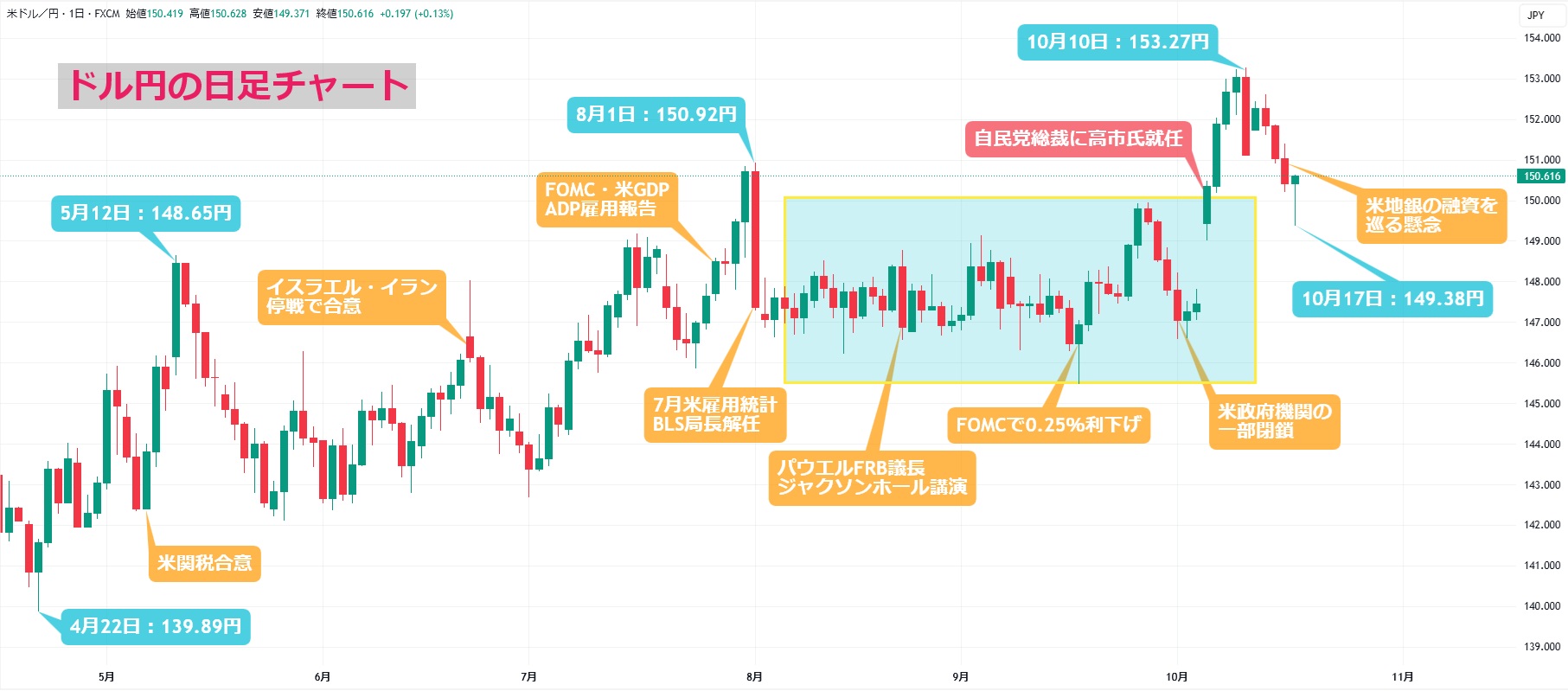 ただ、それ以降は再び軟調に。米政府が米国に入港する中国船の運航事業者から手数料の徴収を開始したことに対して、中国政府は米国船を対象として報復措置を発表。貿易問題を巡る米中対立激化への懸念から、戻り売りなどが出やすい地合いとなりました。トランプ米大統領が自身のSNSに「中国が米国産大豆を購入しないことは経済的に敵対的な行為だ」「報復措置として、食用油をはじめとする中国との貿易取引を停止することを検討中だ」と投稿したことも相場の重しとなりました。16日には米中の貿易摩擦が激化しかねないとの懸念や米地銀の融資を巡る懸念から、米長期金利の指標となる米10年債利回りが一時3.9669%前後と4月7日以来約半年ぶりの低水準を記録。その流れでドル円は17日の夕刻に一時149.38円まで値を下げています。もっとも、その後のNY市場では150.64円まで値を戻しています。