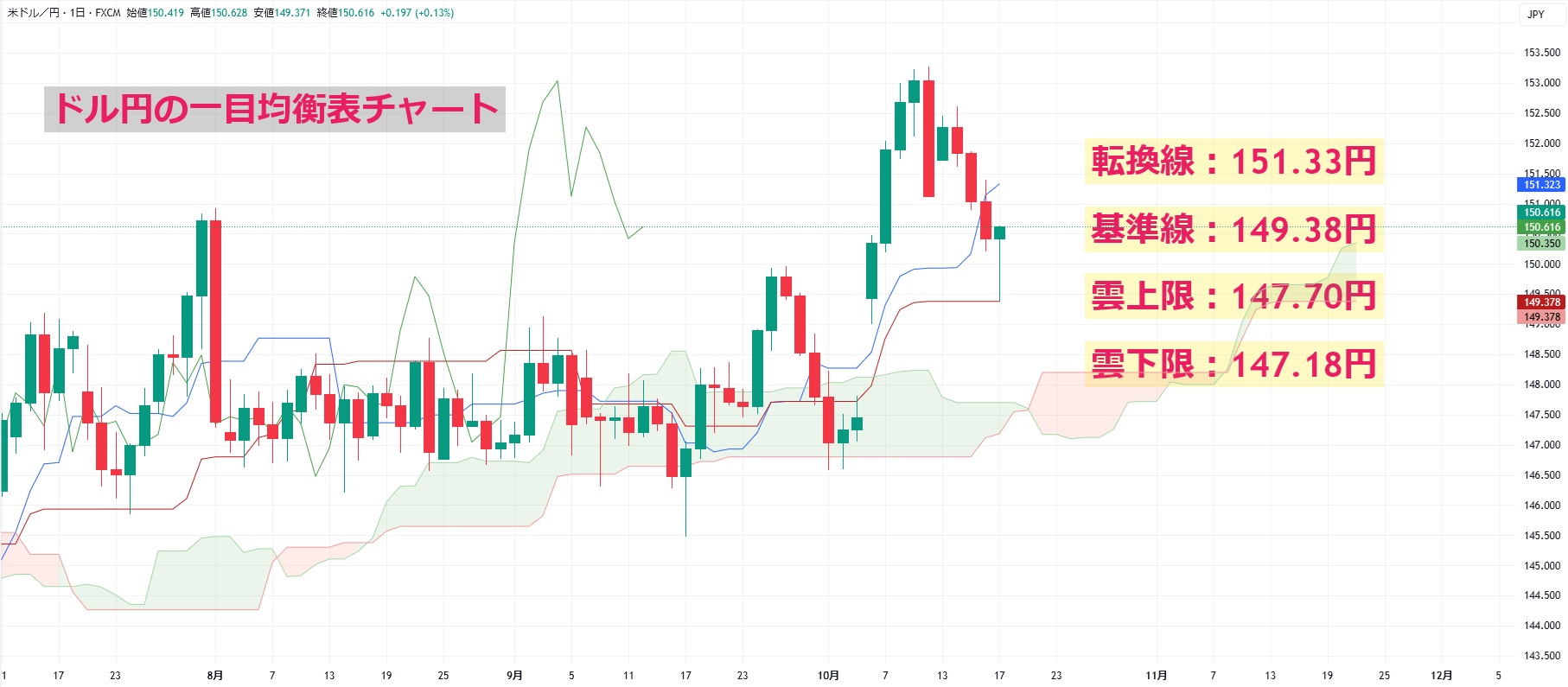 ドル円の一目均衡表チャートを見ると、週末の終値(150.61円)で雲の下限(147.18円)や雲の上限(147.70円)、基準線(149.38円)は上回っていますが、転換線(151.33円)は下回っています。また、「8月から続くレンジをブレイクしている」と言えるほか、重要なポイントである200日移動平均線147.93円を明確に上抜けています。