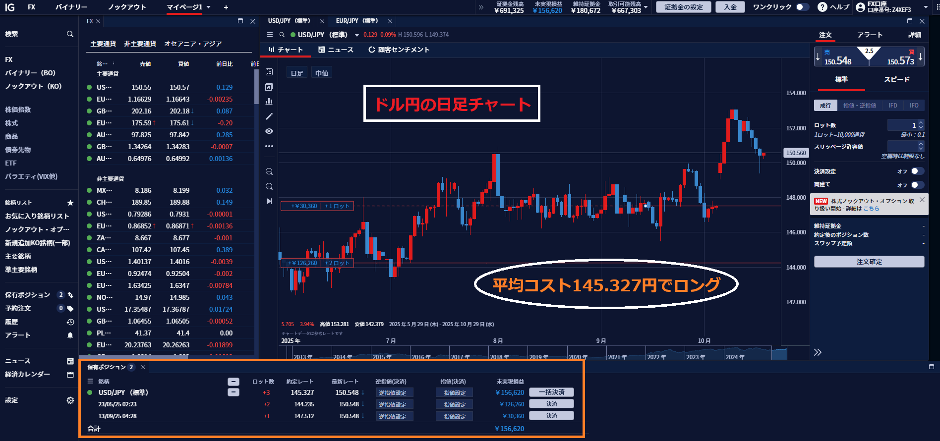 また、米国サイドでは貿易問題を巡る米中対立激化への懸念が和らいだほか、複数の米金融機関が寄り付き前に好業績を発表したことを受けて米地銀の信用不安問題がひとまず一服。米国株相場も反発して週末の取引を終えています。足もとの金融市場は「高市政権誕生」をほぼ織り込みつつあり、「『株高・円安』を見込む『高市トレード』の第一幕が終了した」との見方も一部で浮上していますが、引き続き大きな相場のテーマに変更はないという前提で現在のポジションであるドル円ロング@145.327円は維持したいと思います。