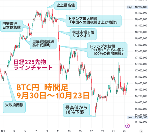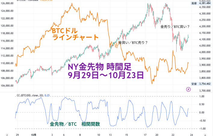 比較チャートで興味深いのは、10月10日辺りからBTCが下げ足を速めたタイミングで金先物が堅調に推移していること。その後、金の上昇が一服して調整売りが入るとBTCが持ち直し、金が再度上がるとBTCは下げ、金急落でBTC反発という動きになっています。