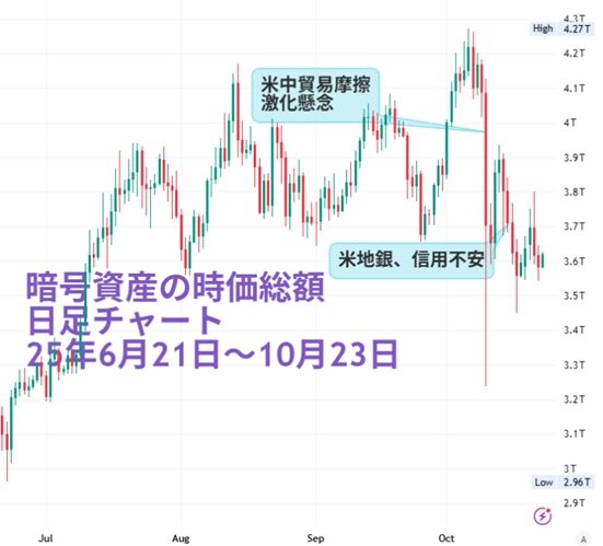 リスク資産に位置づけられるビットコイン(BTC)を含めた暗号資産も、リスク回避の動きに巻き込まれました。