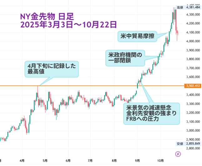 今年に入ってトランプ政権が関税を強化し、世界経済に先行き不透明感が広がりました。これを受けて金への資金逃避が進み、NY金先物は1月末から最高値を更新し続け、4月下旬には年初来で33%超まで上昇率が拡大しました。