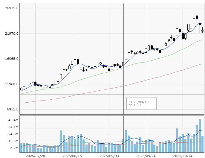 同社株価は2025年4月にはトランプ関税ショックの影響もあり、5730円を付ける場面がありました。そこから、10月21日には上場来高値となる25735円付ける急騰ぶりでした。安値からの上昇率は4.5倍。わずか半年の期間でここまで上昇するとは驚かされます。