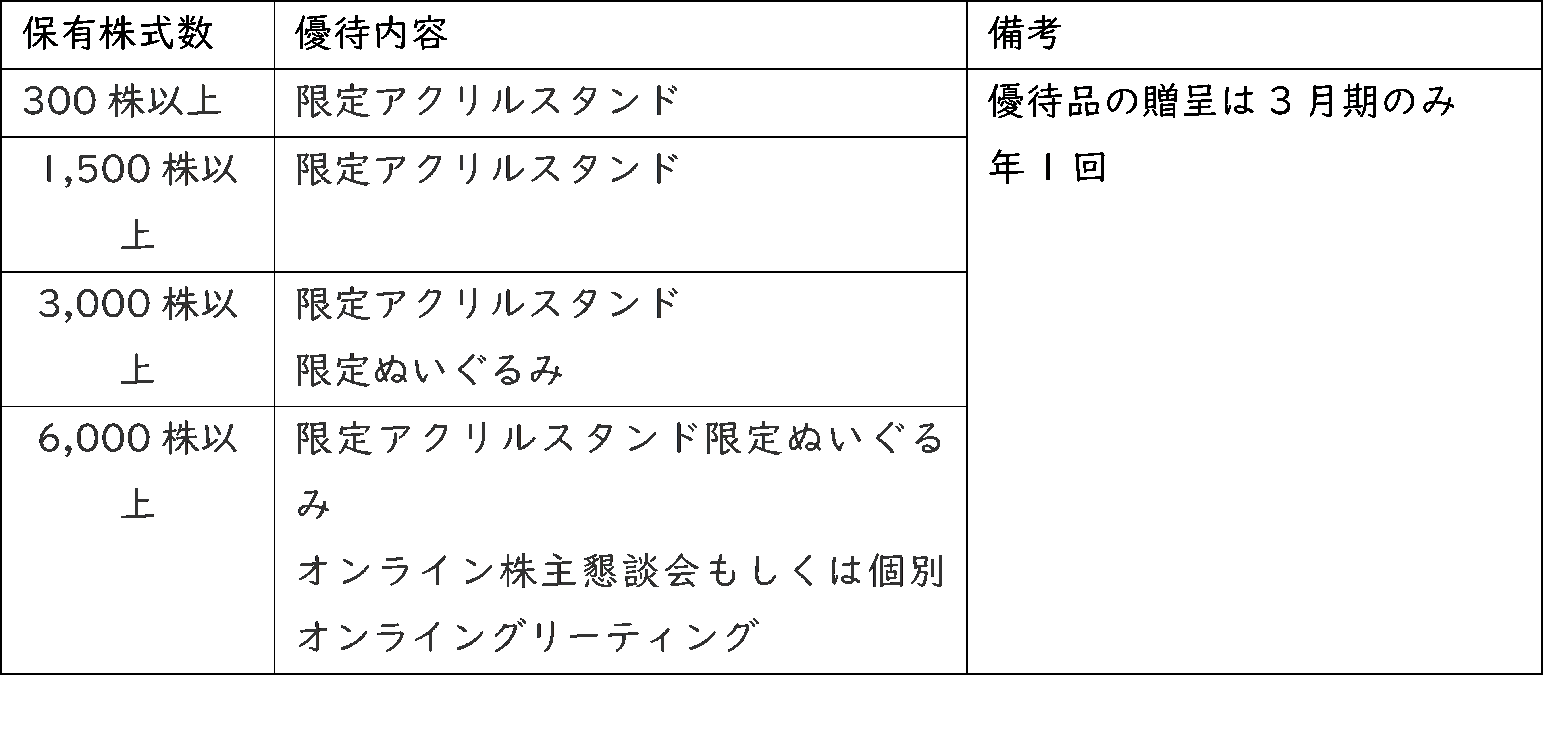同社は2025年3月期より長期保有制度を導入しており、株式を300株以上かつ3年以上継続保有する株主は年1回以下のキャラクター商品などが贈呈されます。