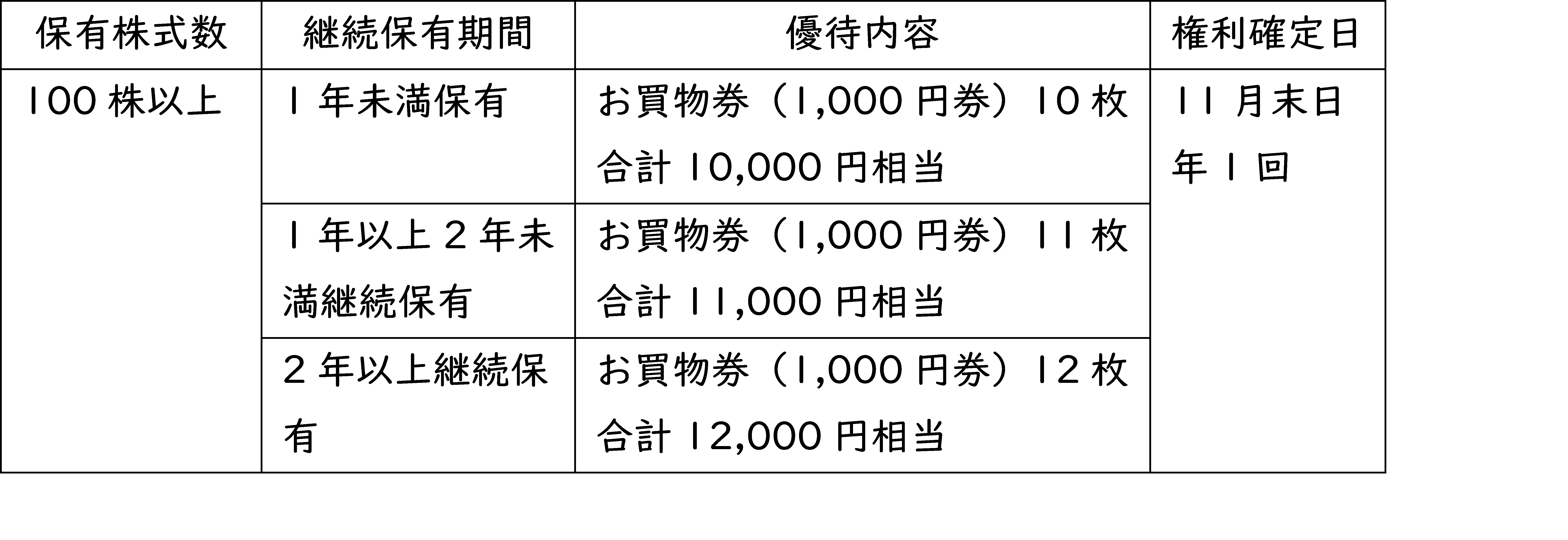 株主優待は、毎年 11月末日現在の株主名簿に記載の100株以上を保有する株主を対象に継続保有期間に応じて贈呈しています。
