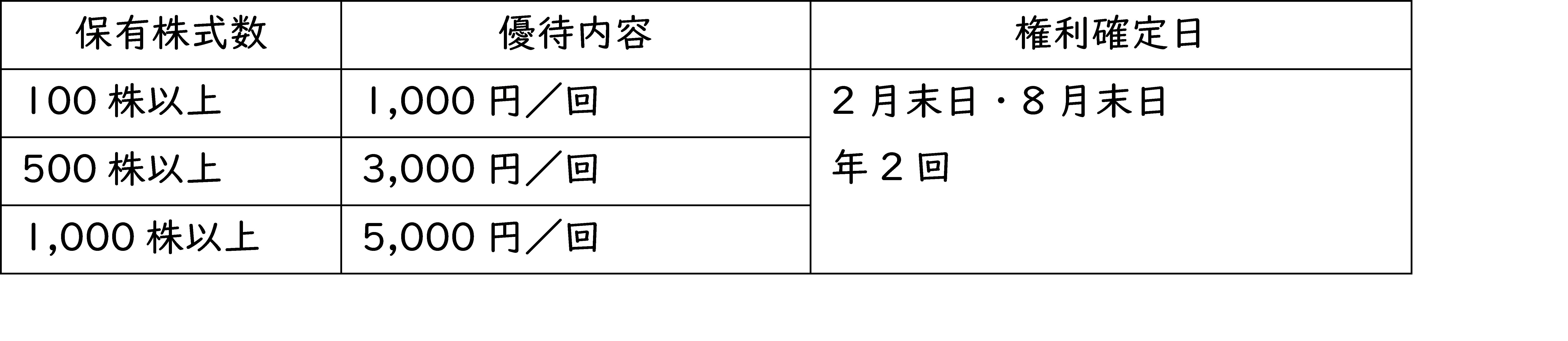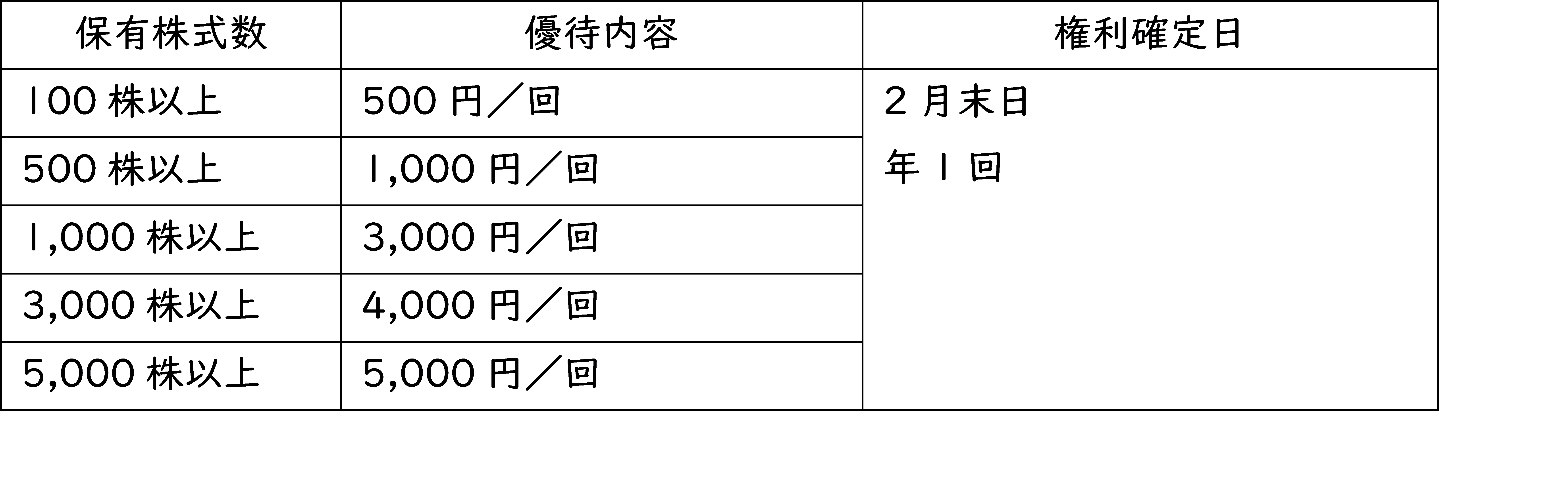 株主優待は、サンリオと同様に通常の株主優待と、長期保有株主(3年以上継続して100株以上保有)向けの優待があり、優待金額を入金(チャージ)したプリペイドカード方式のお買物カード「株主ご優待カード」が贈呈されます。