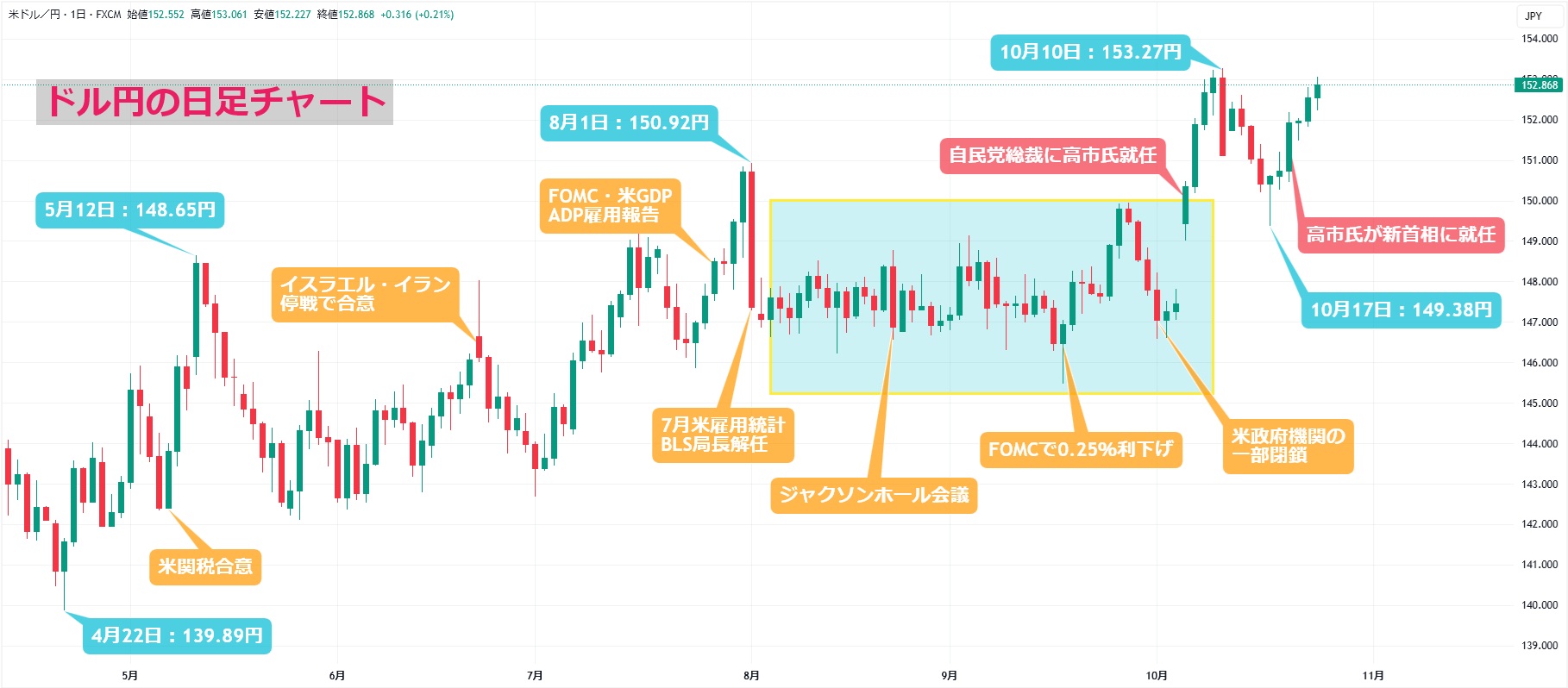 今週のドル円は底堅い展開となりました。前週末の17日には米中の貿易摩擦が激化しかねないとの懸念や米地銀の融資を巡る懸念から、米長期金利が4月7日以来約半年ぶりの低水準を記録する中、一時149.38円まで値を下げました。ただ、週明け20日には日本の為替証拠金取引(FX)業者の取引が開始される7時を過ぎると買いが先行しました。自民党・日本維新の会が政策協議で合意するとの期待感が高まる中、「高市トレード(円売り・株買い)」が再燃する形となりました。積極財政や金融緩和を志向するとされる高市早苗氏が新首相に就任したことでいったんは「材料出尽くし」として売りも出ましたが、日米株価指数が史上最高値を更新する中、終始底堅い展開が続きました。24日には一時153.06円まで値を上げ、10日の高値153.27円に近付きました。