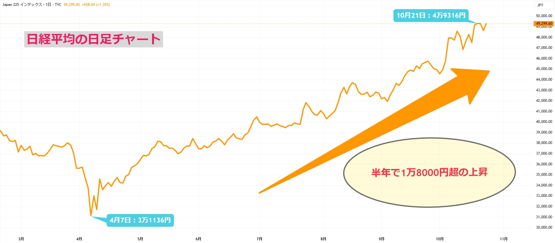 なお、東京株式市場では21日に日経平均が史上最高値を更新。市場では「自民党総裁選前から上昇してきたが、高市政権が誕生し、さらにブーストした」との声が聞かれた一方、「期待先行で上昇してきただけに、少数与党政権がどこまで政策を実行できるかは今後の焦点」との指摘がありました。今週、日経平均先物は節目の5万円にワンタッチしています。現物でも5万円の節目を突破することが期待されます。