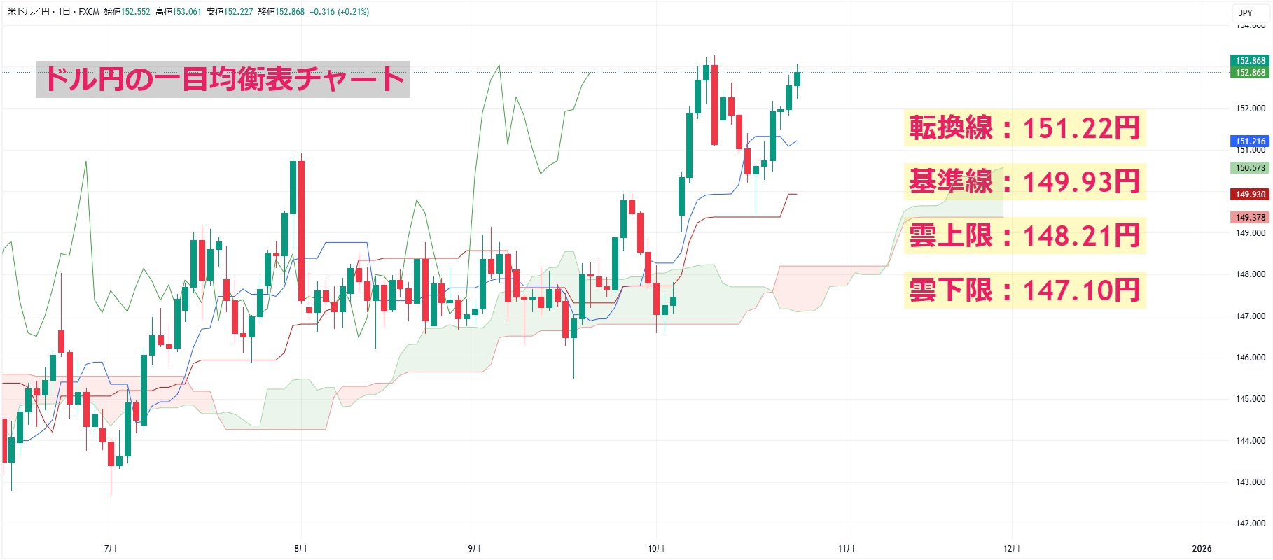 ドル円の一目均衡表チャートを見ると、週末の終値(152.86円)で雲の下限(147.10円)や雲の上限(148.21円)、基準線(149.93円)、転換線(151.22円)をすべて上回っています。また、「8月から続くレンジを明確にブレイクした」とも言えるため、テクニカル的にも買いが入りやすい地合いです。当然、重要なポイントである200日移動平均線147.82円は大きく上抜けている状況です。