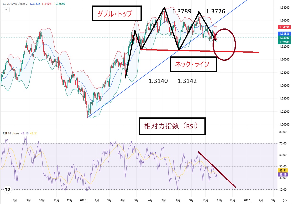 短期的には、1.3789ドルと1.3726ドルを頭とするダブル・トップを形成中であり、ネック・ライン(1.3140ドル~1.3142ドル)の下抜けを待つ展開となっています。