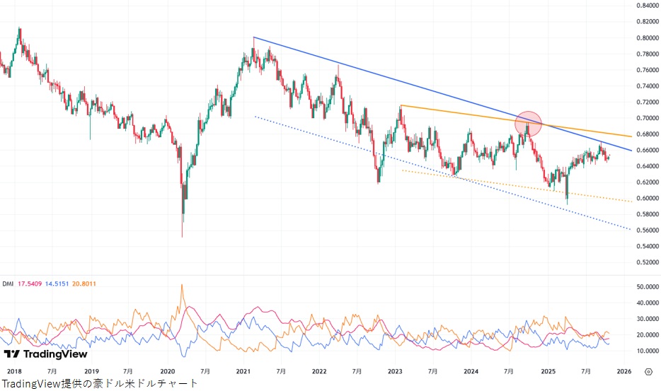 ただ、足もとの豪ドル米ドルを確認すると9月半ばから上値を切り下げる展開となり、今月中旬になって「DMI」も-DI>+DI(下落トレンド)を示唆。ここからは9月からの短期的な下落が上昇トレンド内の調整局面に過ぎないのか、それともトレンドの転換を迎えつつあるのか、見極める必要があるでしょう。