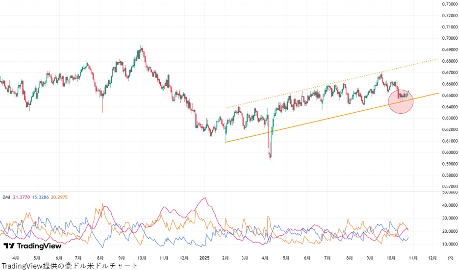 ここでもポイントになるのは直近安値を維持できるかどうか。10月14日と17日に2度下げ止まった0.6440米ドル台(チャート上の丸で囲った部分)がカギを握ります。