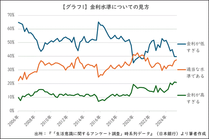 最も多かったのは「金利が低すぎる」で39.8%。37.4%の「適当な水準である」をやや上回りました。金利の見方についての推移を見ると、「金利が高すぎる」と感じる人が少しずつ増えている様子が伺えます【グラフ1】。