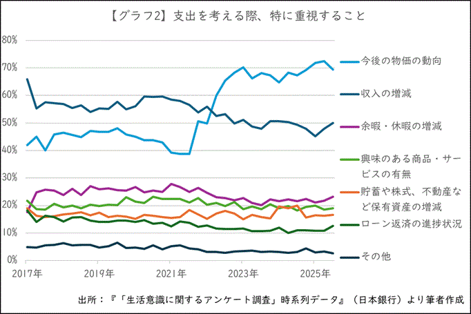 今後1年間の支出で特に重視することとしては、約7割の人が「今後の物価の動向」と回答。物価の動向は2022年6月調査で「収入の増減」を抜いてトップになり、以後高水準で推移しています【グラフ2】。